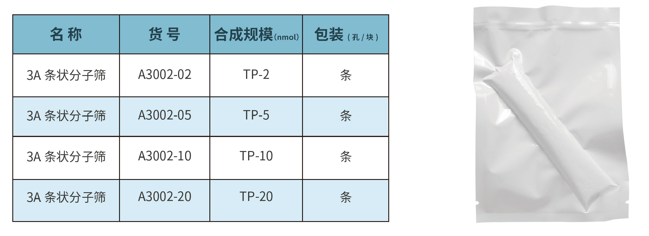 條狀分子篩用于吸附溶劑和溶液中的微量水。最初是為合成寡核苷酸而設計的,方便、無灰塵、無絨布,可添加到多種溶劑和有機溶液中去除含有的微量水。在DNA合成測試中,條狀分子篩可將乙腈和活化劑瓶中的含水量保持在10ppm以下,而不用擔心閥門或節流閥被分子篩上的灰塵或包裝袋上的絨毛堵塞??芍苯佑糜?00ml、1L、4L等溶劑瓶的脫水,條狀分子篩規格亦可定制。